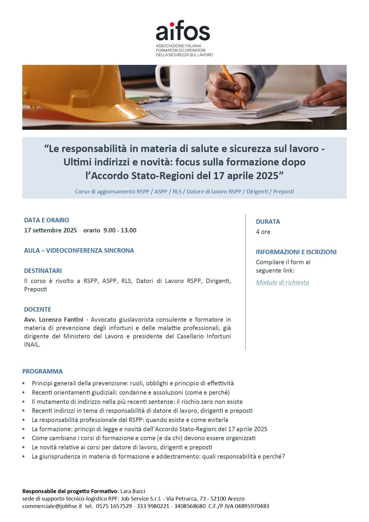 Nuovo Accordo Stato-Regioni 17/04/2025: Formazione Salute e Sicurezza sul Lavoro Il nuovo Accordo Stato-Regioni del 17 aprile 2025, relativo alla formazione in materia di Salute e Sicurezza sul Lavoro, è entrato ufficialmente in vigore il 24 maggio 2025, a seguito della pubblicazione nella Gazzetta Ufficiale Serie Generale n. 119. Da tale data decorre il periodo transitorio di 12 mesi, necessario per adeguarsi alle nuove disposizioni. Di seguito le principali novità introdotte dal nuovo Accordo “quadro” che sostituisce e unifica i precedenti accordi (A.S.R. 21/12/2011, 22/02/2012, 25/07/2012, 07/07/2016). π Corsi e aggiornamentiti: nuove durate e regole π· Formazione Lavoratori β Non è più previsto il termine di 60 giorni dall’assunzione per completare la formazione β La formazione deve avvenire in occasione della costituzione del rapporto di lavoro β Per i lavoratori stranieri, i corsi dovranno essere realizzati previa verifica della comprensione della lingua veicolare e con modalità che ne assicurino la comprensione (es. tramite mediatore interculturale o traduttore) π¦Ί Formazione Preposti β Durata: da 8 a 12 ore β Modalità: esclusivamente in presenza o videoconferenza sincrona (escluso e-learning) β Aggiornamento: ogni 2 anni, durata minima 6 ore π Formazione Dirigenti β Durata: da 16 a 12 ore, con modulo aggiuntivo di 6 ore per chi opera nei “cantieri” β Aggiornamento: ogni 5 anni, durata minima 6 ore πΌ Formazione Datori di Lavoro β Obbligo formativo per tutti i datori di lavoro che non svolgono anche il ruolo di RSPP β Termine: entro il 24 maggio 2027 β Durata: 16 ore, con modulo aggiuntivo di 6 ore per chi opera nei “cantieri” β Aggiornamento: ogni 5 anni, durata minima 6 ore π’ Formazione Datori di Lavoro RSPP β Requisito: corso di formazione per Datori di Lavoro completato β Modulo comune: 8 ore β Moduli integrativi per settore: • Agricoltura / Silvicoltura / Zootecnica → 16 ore • Pesca → 12 ore • Costruzioni → 16 ore • Chimico / Petrolchimico → 16 ore β Aggiornamento: ogni 5 anni, durata minima 8 ore β οΈ Formazione per Lavoratori, Datori di lavoro e Lavoratori autonomi che operano in ambienti sospetti di inquinamento o confinati β Corso obbligatorio di 12 ore, esclusivamente in presenza β Termine: entro 24 maggio 2026 ποΈ Formazione per abilitazione utilizzo attrezzature di lavoro β Corsi di prima formazione e aggiornamento esclusivamente in presenza (modulo teoricotecnico e parte pratica) β Nuovo obbligo di formazione, entro 24 maggio 2026, per addetti alla conduzione di: • Carriponte • Caricatori per movimentazione materiali (CMM) • Macchine agricole raccoglifrutta (CRF) β Formazione macchine movimento terra: eliminato il limite di massa < 6.000 kg, per cui rientrano nell’obbligo di formazione abilitante anche i c.d. miniescavatori π Organizzazione dei corsi Per ciascun corso il soggetto formatore deve: βΈ Predisporre il progetto formativo secondo l’ASR βΈ Ammettere massimo 30 partecipanti/corso (eccetto corsi e-learning) βΈ Per attività pratiche: rapporto docente/discente ≤ 1:6 βΈ Tenere registro presenze (in formato cartaceo o elettronico) βΈ Verificare frequenza ≥ 90% per accesso alla verifica finale di apprendimento βΈ Redigere verbale della verifica finale βΈ Predisporre attestato di formazione βΈ Conservare (in formato cartaceo o elettronico) il “Fascicolo del corso” per almeno 10 anni π» Modalità di erogazione β Presenza fisica β Videoconferenza sincrona (ogni discente deve essere collegato tramite PC o tablet a suo uso esclusivo, non è ammesso l’uso dello Smartphone) β E-learning (asincrono) β Modalità mista β